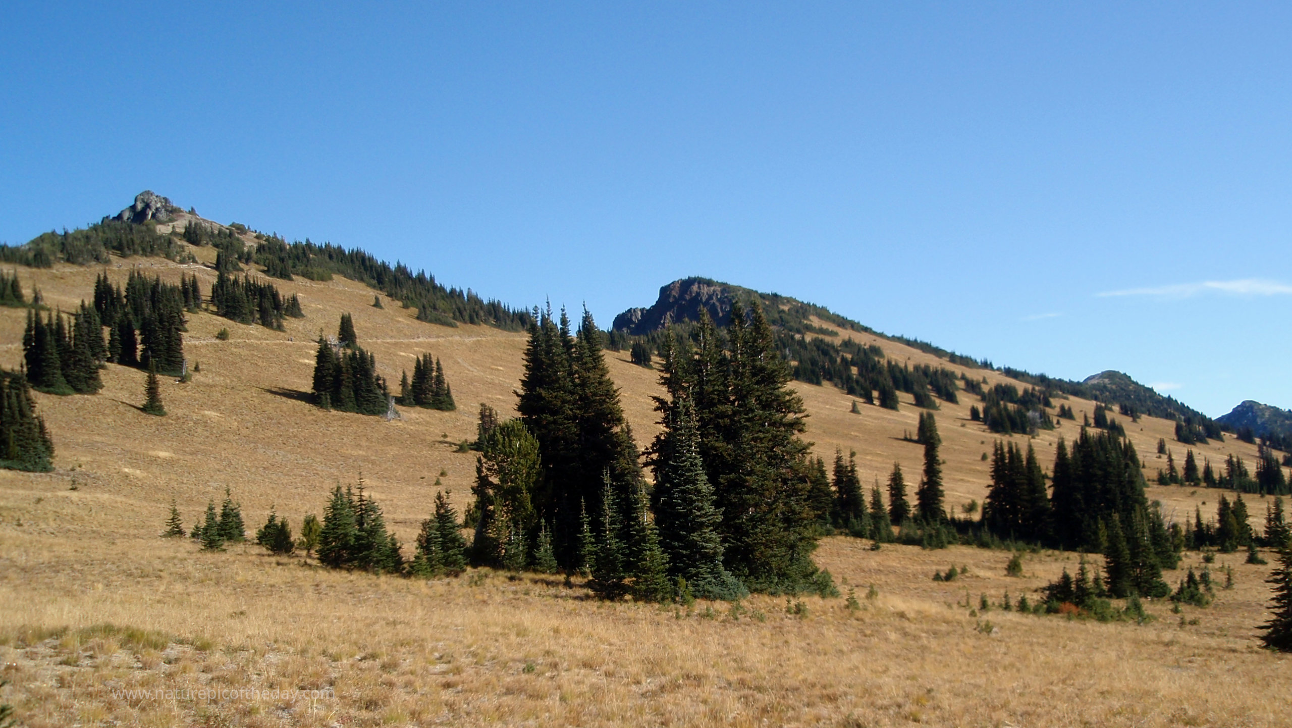 A distant trail leads up to the sharp twin peaks at Mount Rainier's Sunrise area.