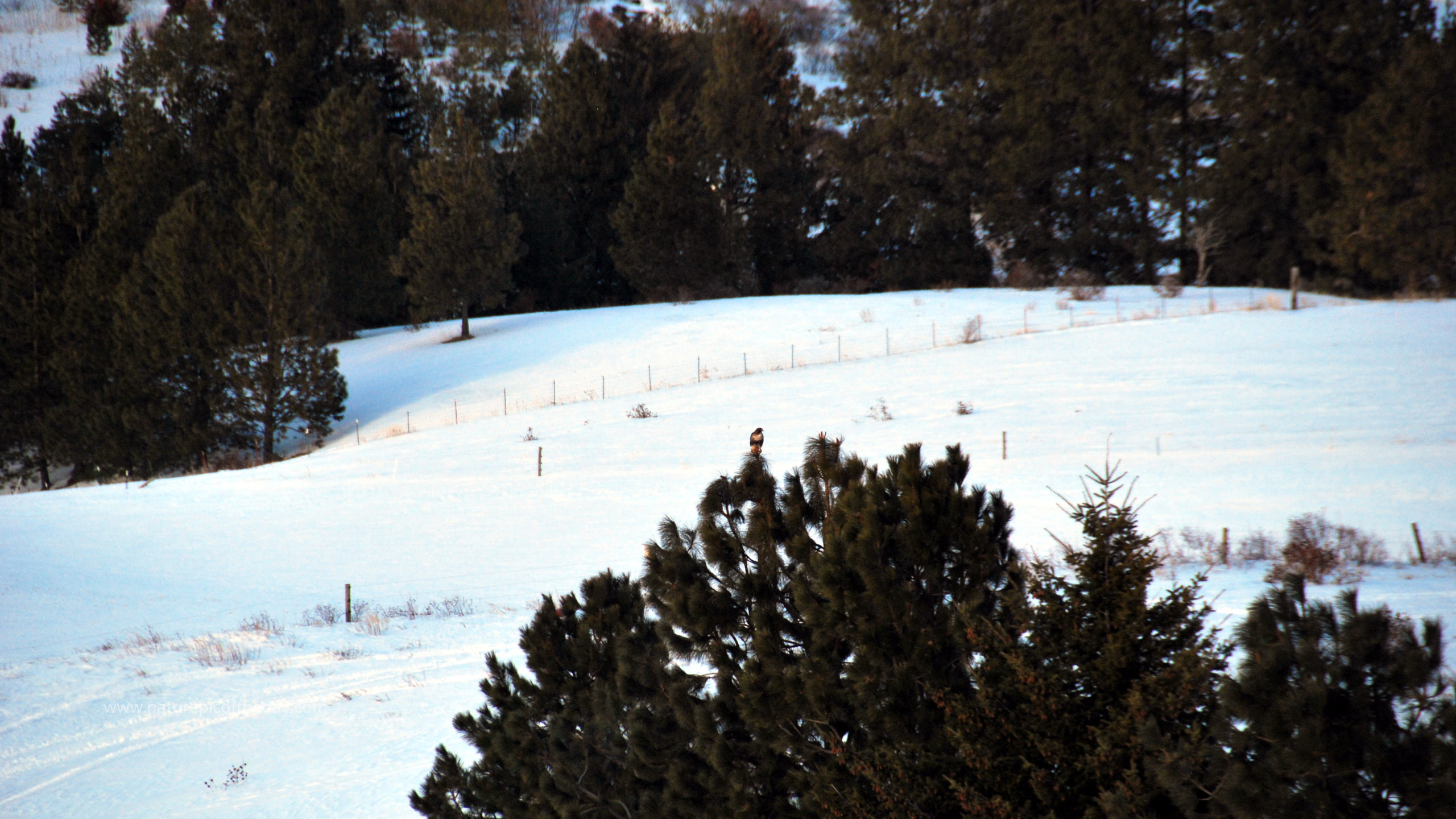 A cold field hawk catches the last of the day's sunlight from it's lonely perch.
