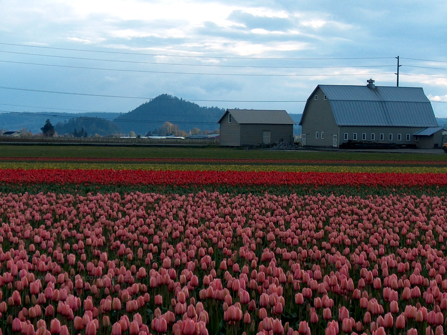 Fields of colorful tulips cover the floor of Washington State's Skagit Valley.