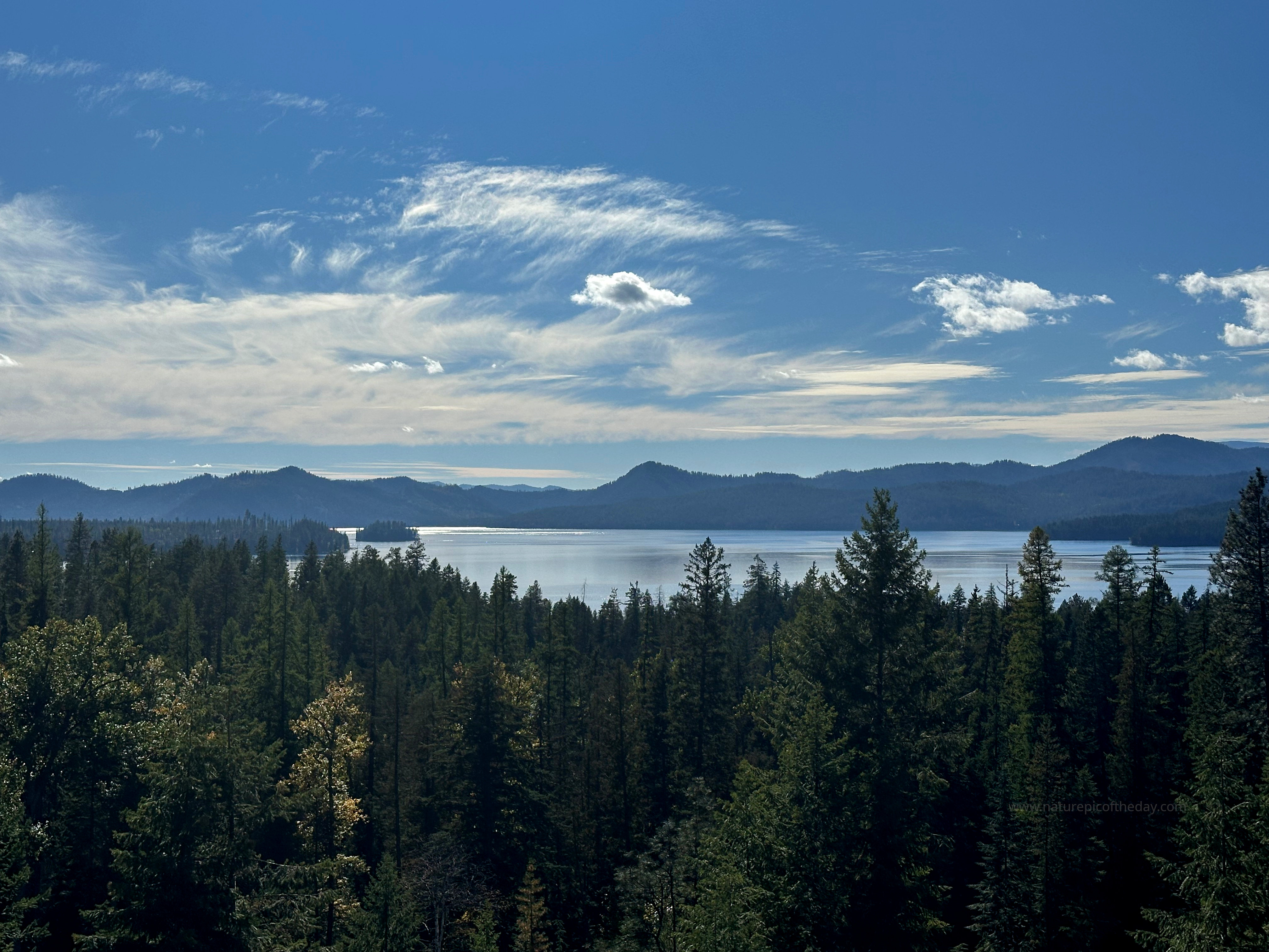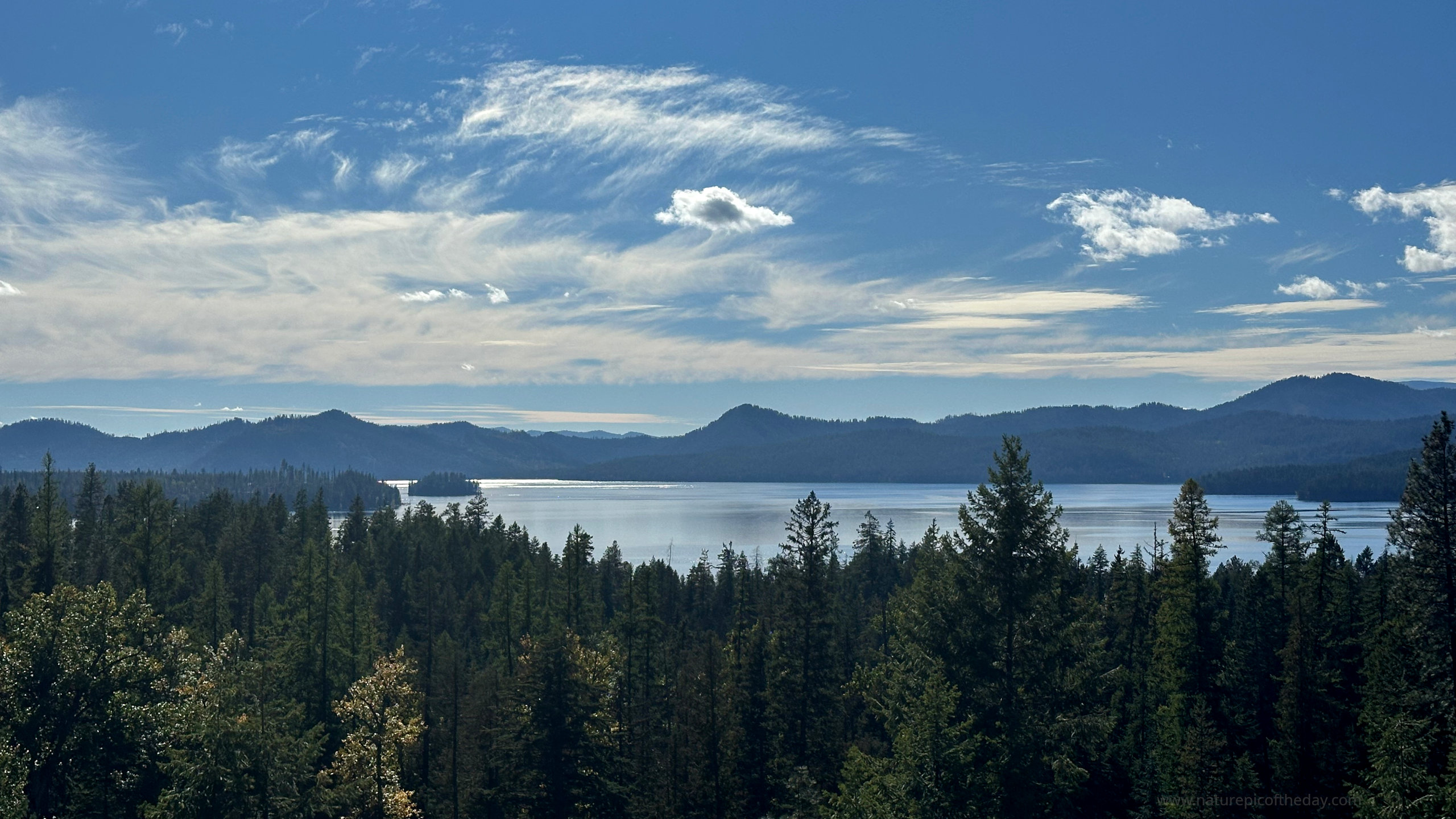 Surrounded by forest, Priest Lake in northern Idaho sits underneath a hazy fall sky.