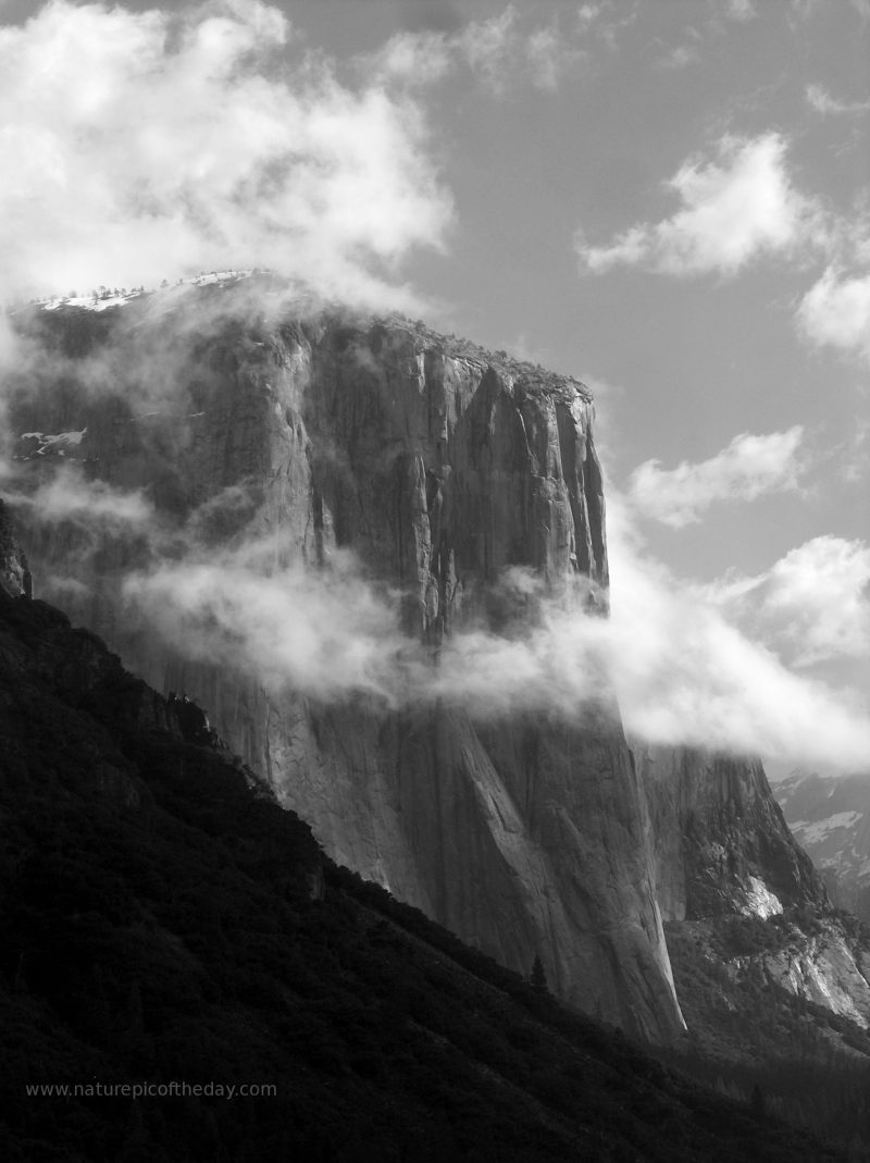 Credit & Copyright: NPOD El Capitan:Looming more than 3,000 feet above Yosemite Valley, El Capitan is a favorite of rock climbers around the world. This shot captures the magnificent captain in early spring, with snow still clinging to the top and clouds wisping around the face.
