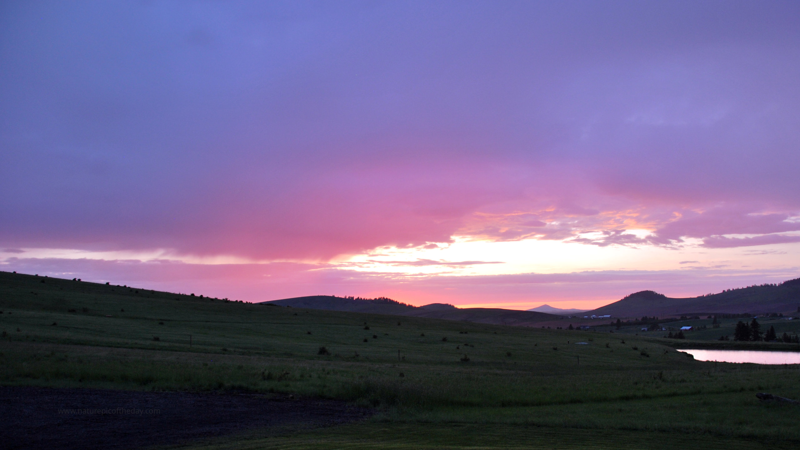 The setting sun creates a gentle glow over the green prairie of the Palouse.
