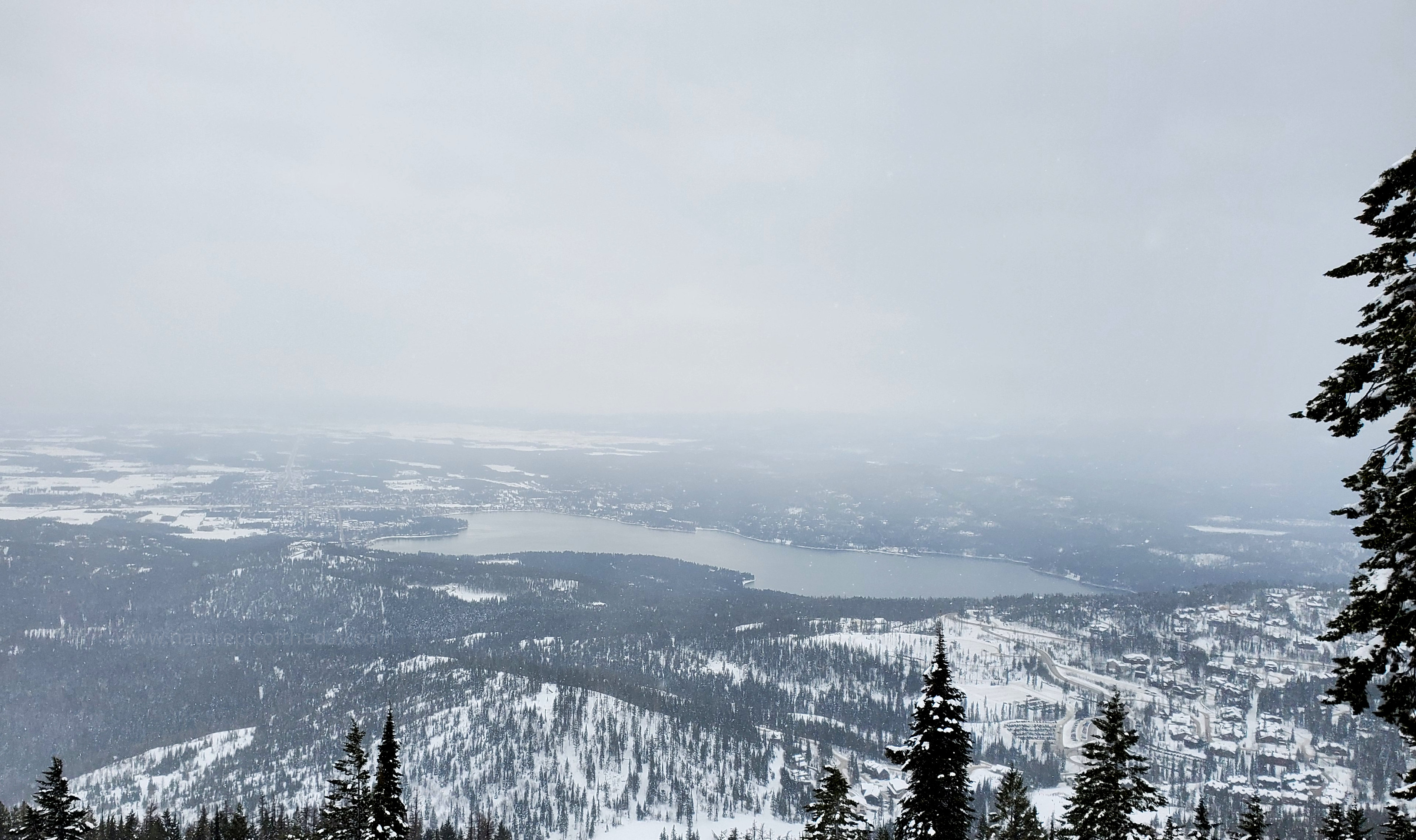 Whitefish lake appears through the storm on a snowy day on the Big Mountain in Whitefish, Montana.