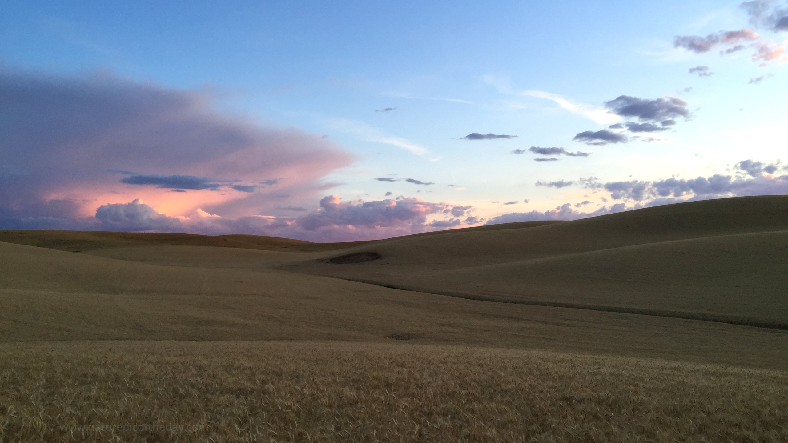 Fields of gold wave in the early morning breeze under a sky of pink.