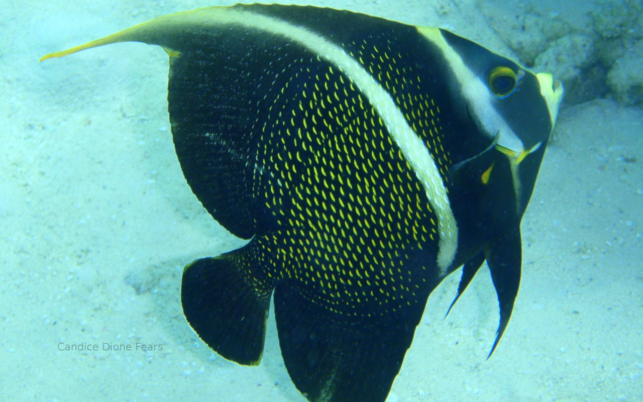 Trinidad about 10years ago said: Lovely picture. This is probably a 'teenage' French angel. The juveniles have large stripes only; and the adults just the speckled yellow scales.