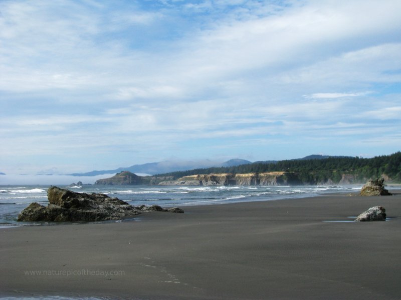 A cool mist hugs Oregon's Pacific coast late in the day, refusing to yield to the sun.