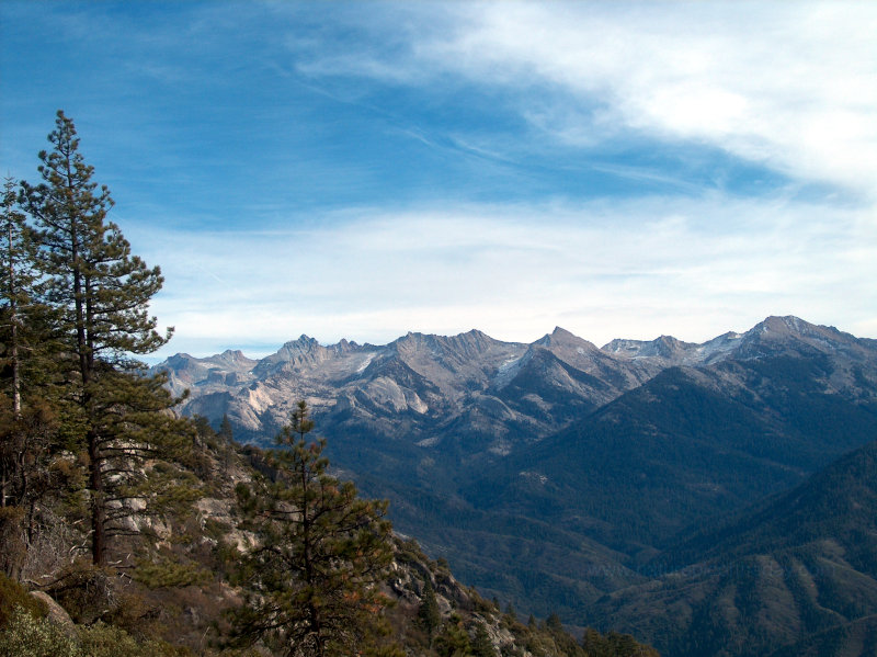 The granite peaks of the Sierra Nevada Mountains touch the blue skies over California.