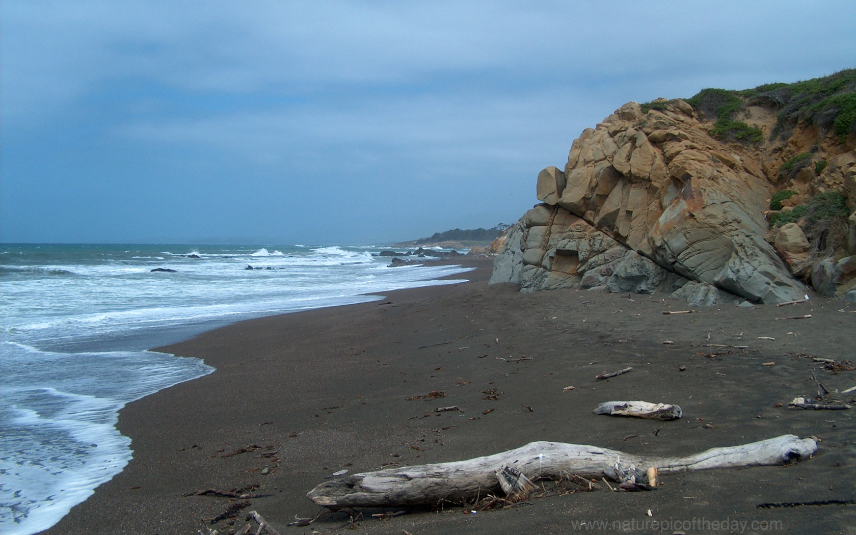 Fresh waves bring logs and driftwood to a rocky beach on the coast of California.