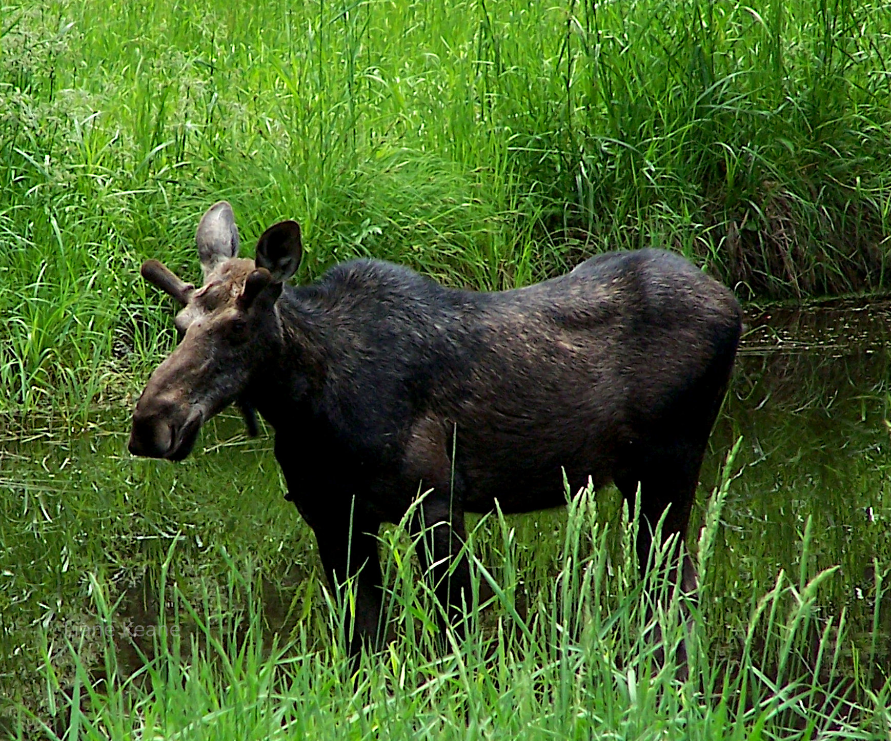 A bull moose wades through the deep pond and feeds on the tall, lush, grass.