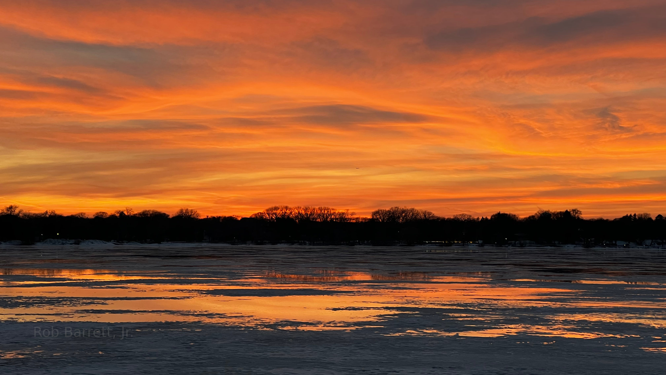 A beautiful sunset reflects off the frozen waters of one of Minnesota's lakes.