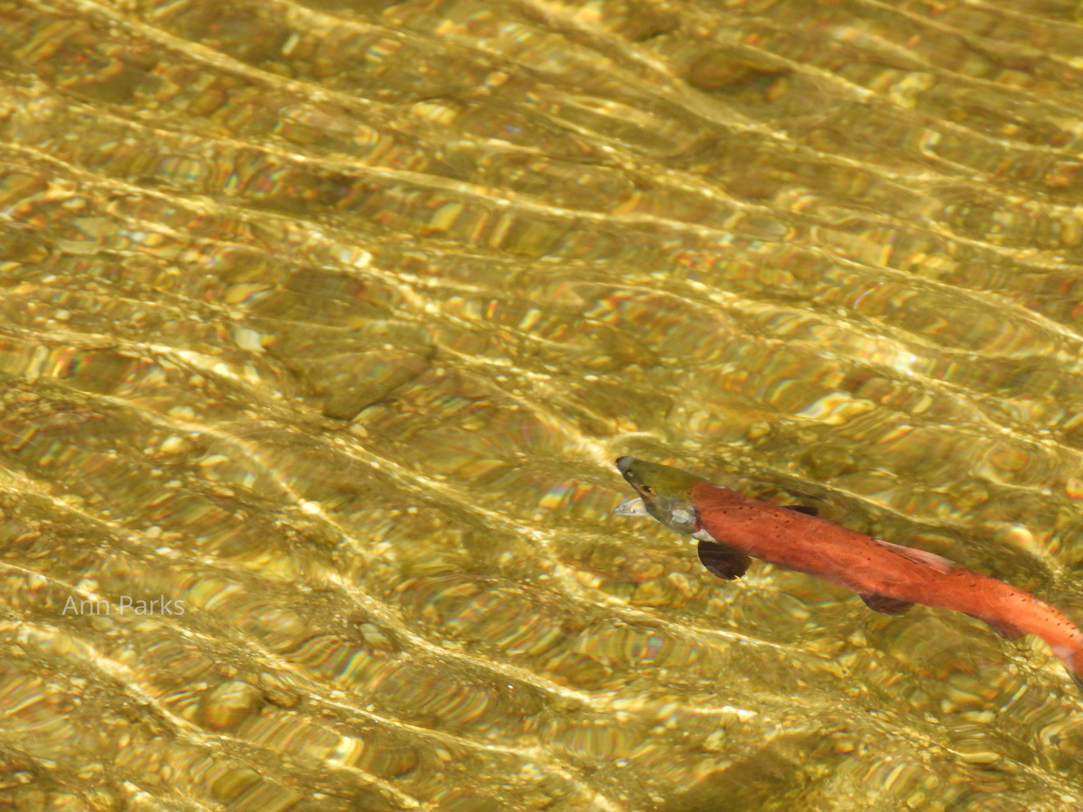 Kokanee salmon swim up a golden stream in Northern Idaho.