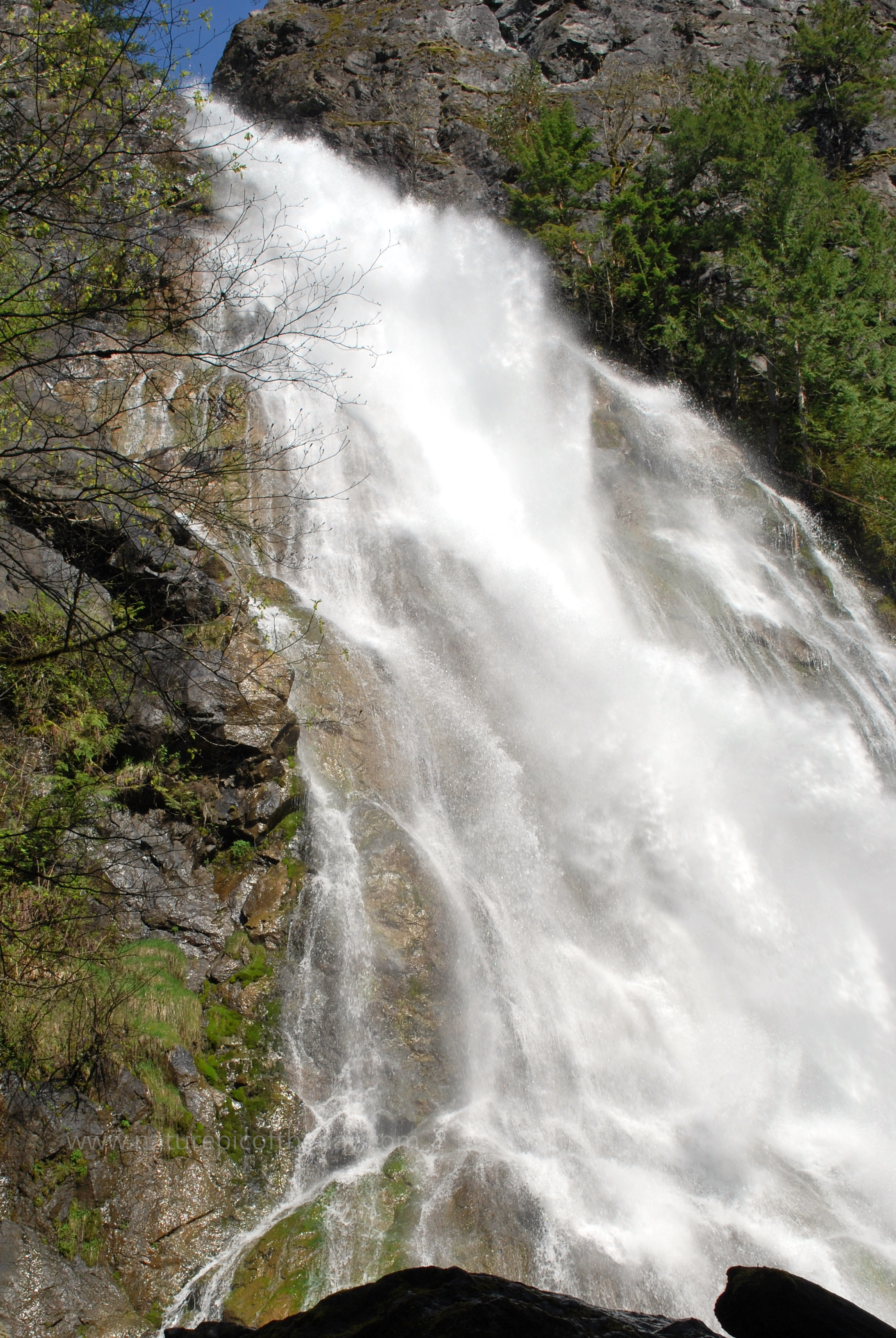 A large waterfall fans out wide as it cascades down the sheer cliffs near Brinnon, Washington.