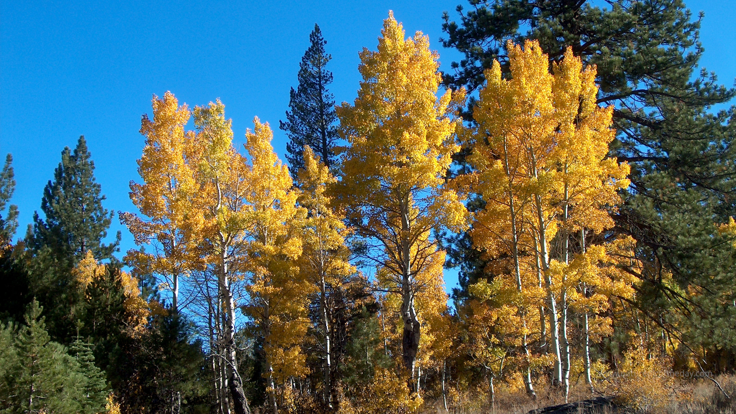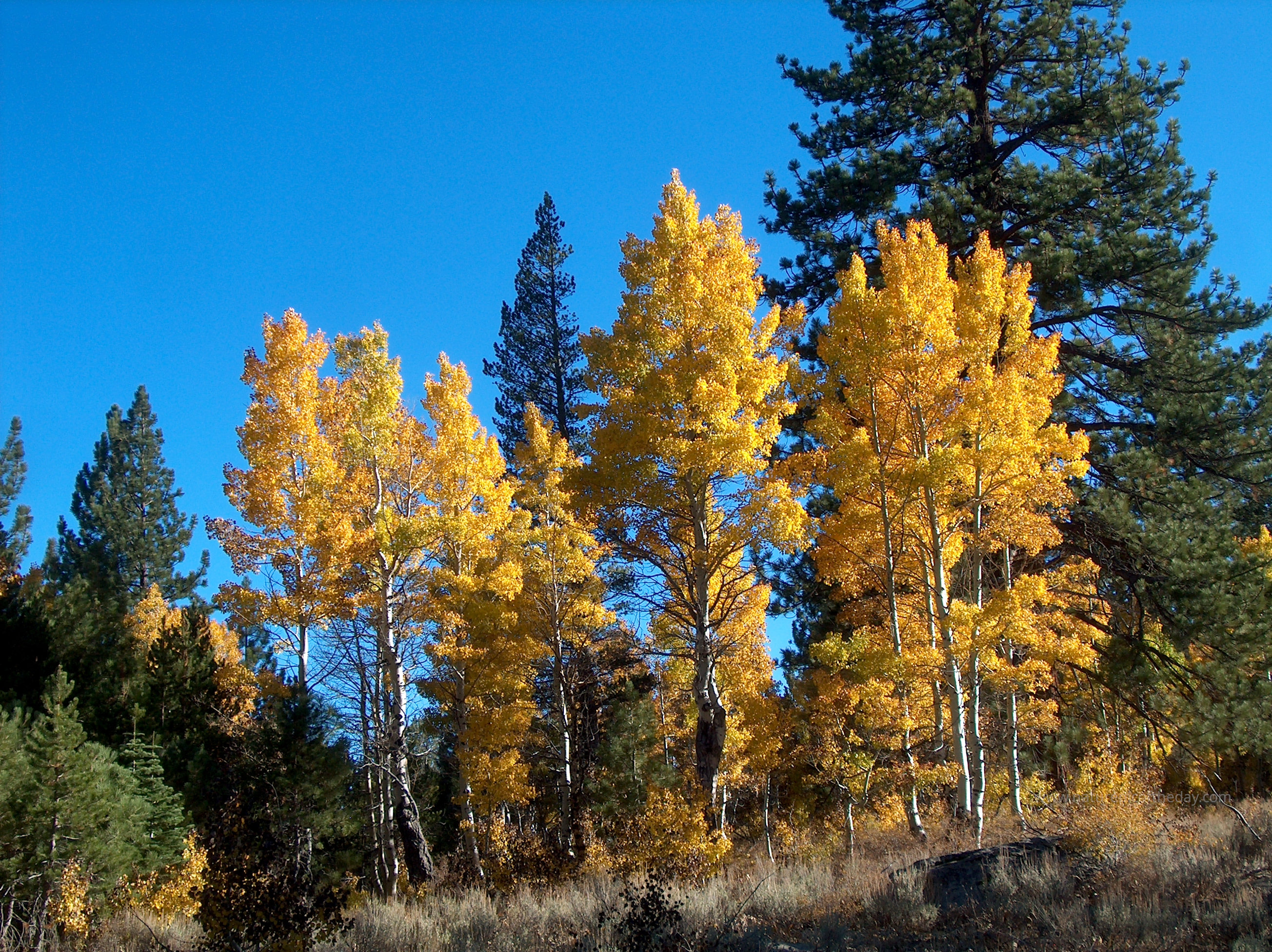 Autumn brings a blaze of golden color high up in the Sierra Nevada mountains of California.