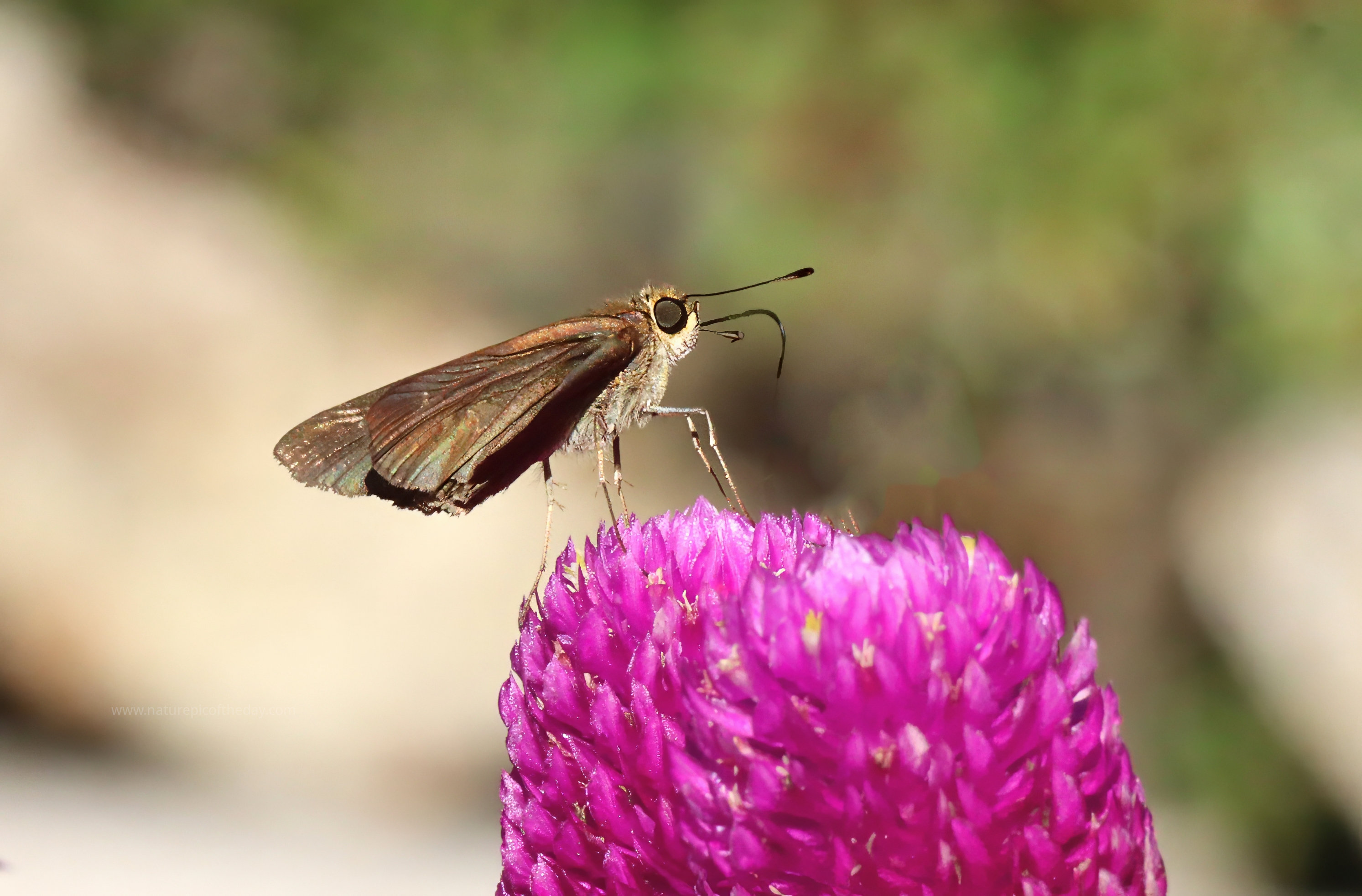 Credit & Copyright: Anonymous from Orlando, FL Inch-Long Butterfly:"This skipper butterfly has typically large eyes and is only about an inch long. Its proboscis is aimed at the bright flowers of a globe amaranth."