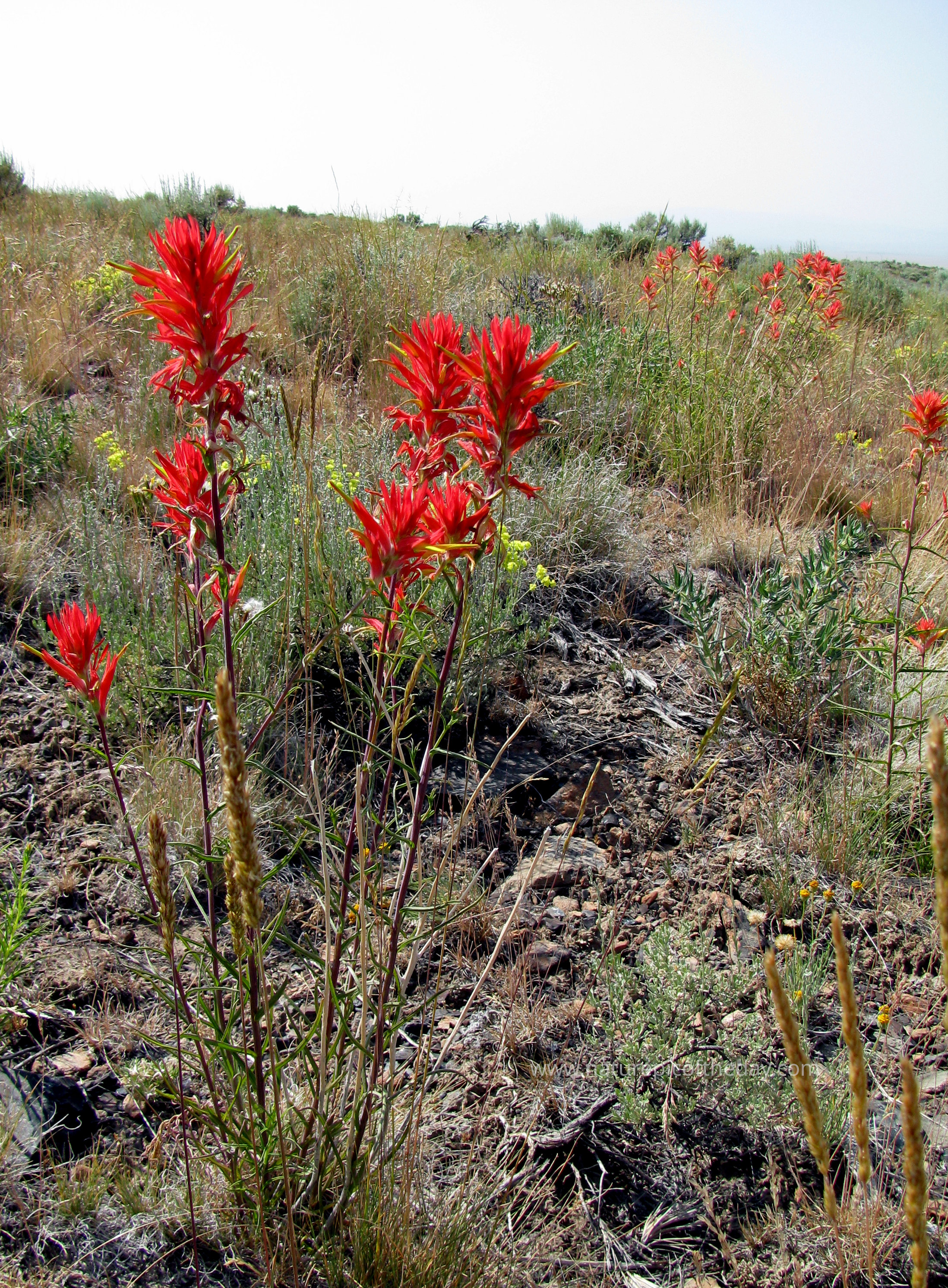 A fiery, red, Indian Paintbrush beautifies the land dried out from summer heat.