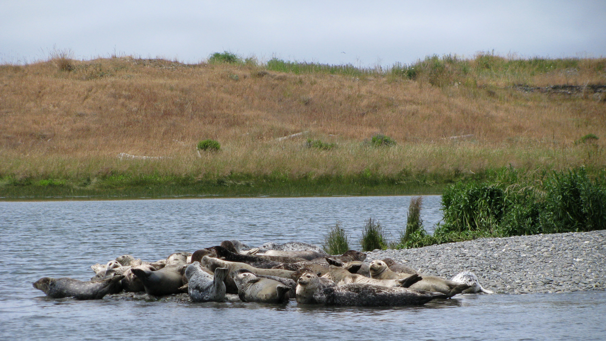 A pod of harbor seals bask in the sun together at Gold Beach, Oregon.