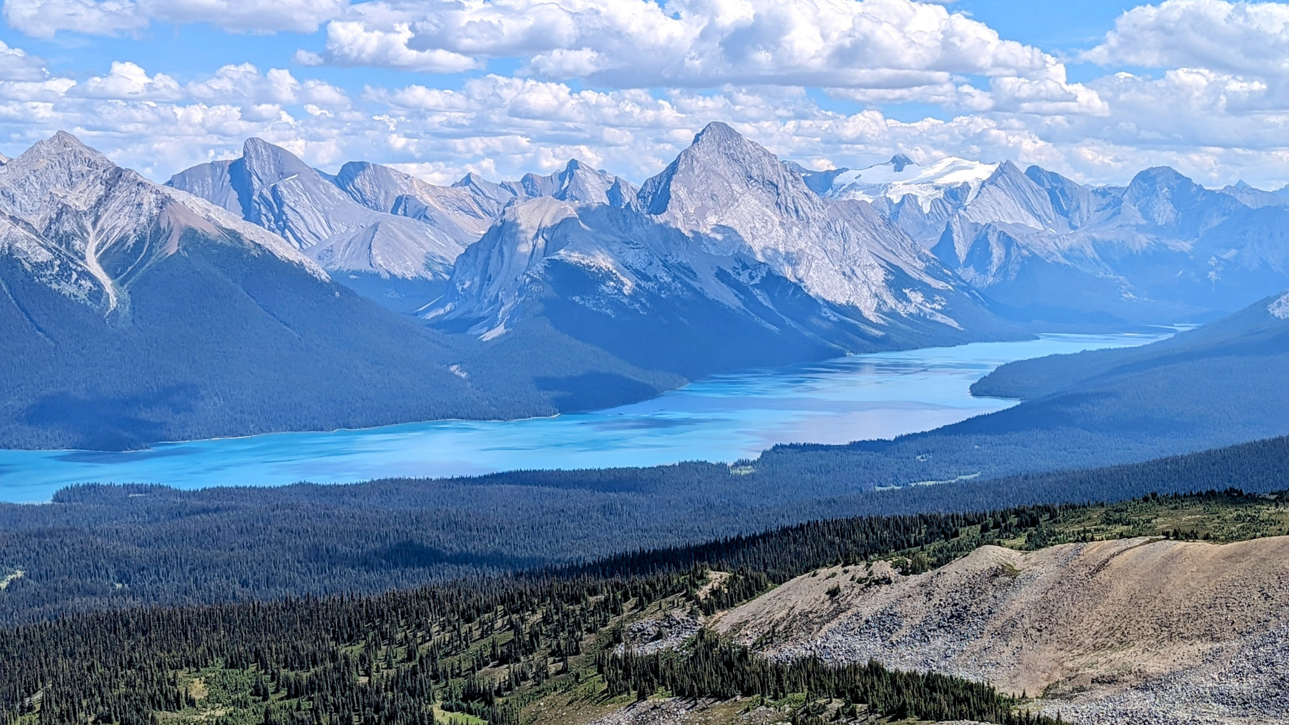 Credit & Copyright: Jenna Kyle from Columbia Falls, MT Maligne Lake:"Maligne Lake stretches below the snow-capped Canadian Rockies in the late July sun."