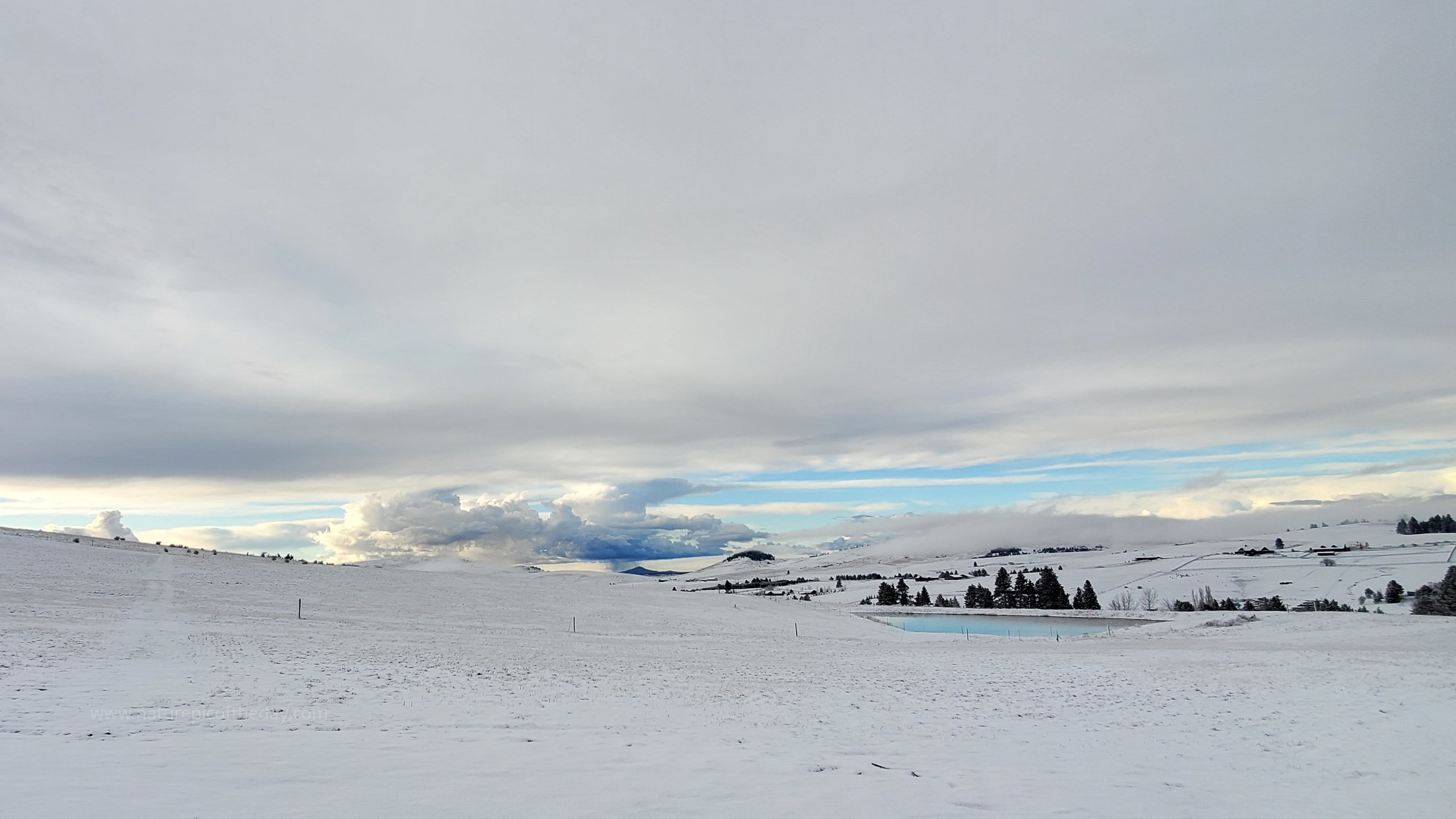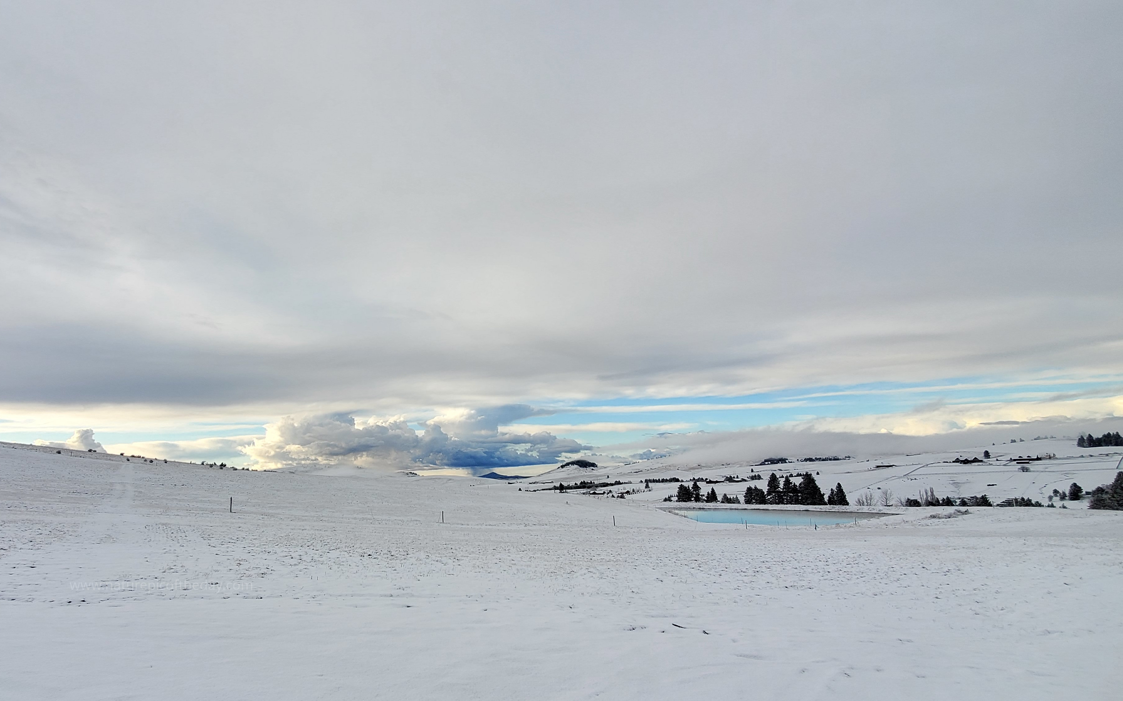 A pond reflects bits of the blue sky in this winter paradise.