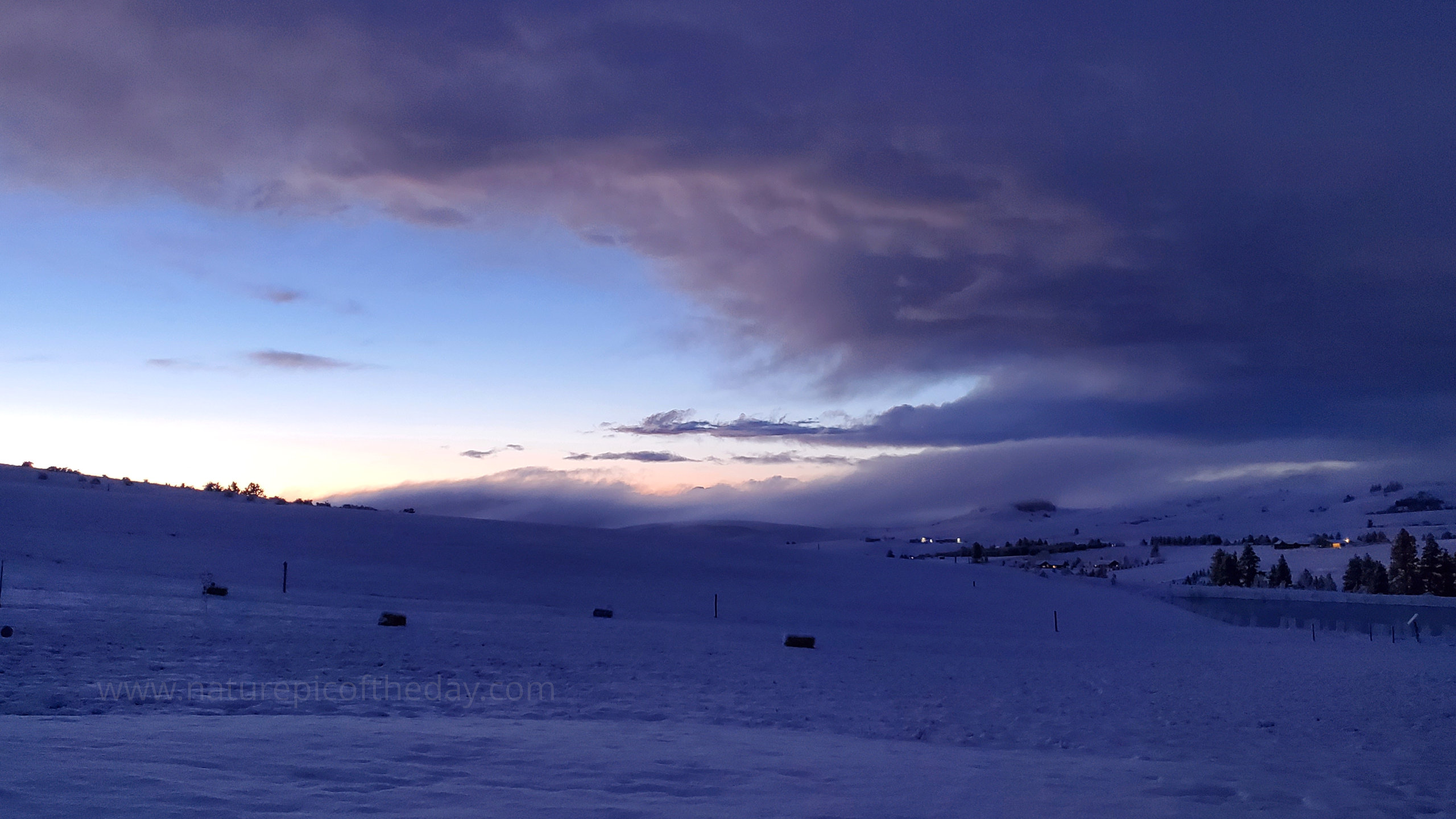 The temperature starts to drop as the snow clouds part at the start of a long winter night.