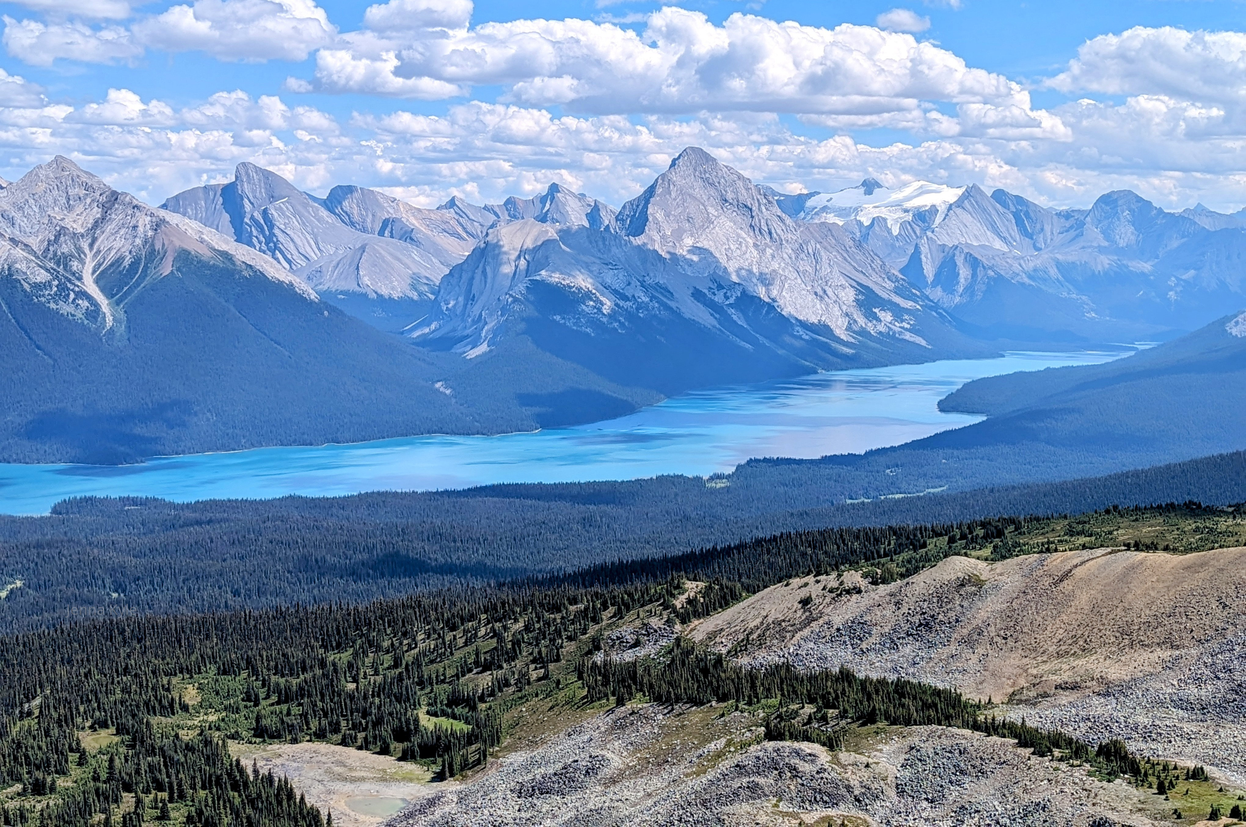 Credit & Copyright: Jenna Kyle from Columbia Falls, MT Maligne Lake:"Maligne Lake stretches below the snow-capped Canadian Rockies in the late July sun."