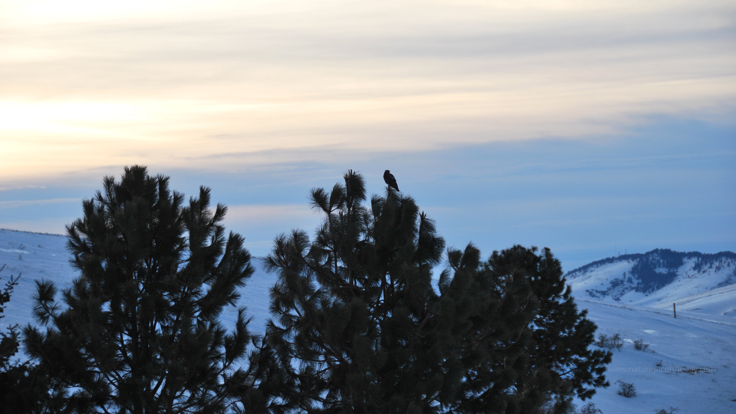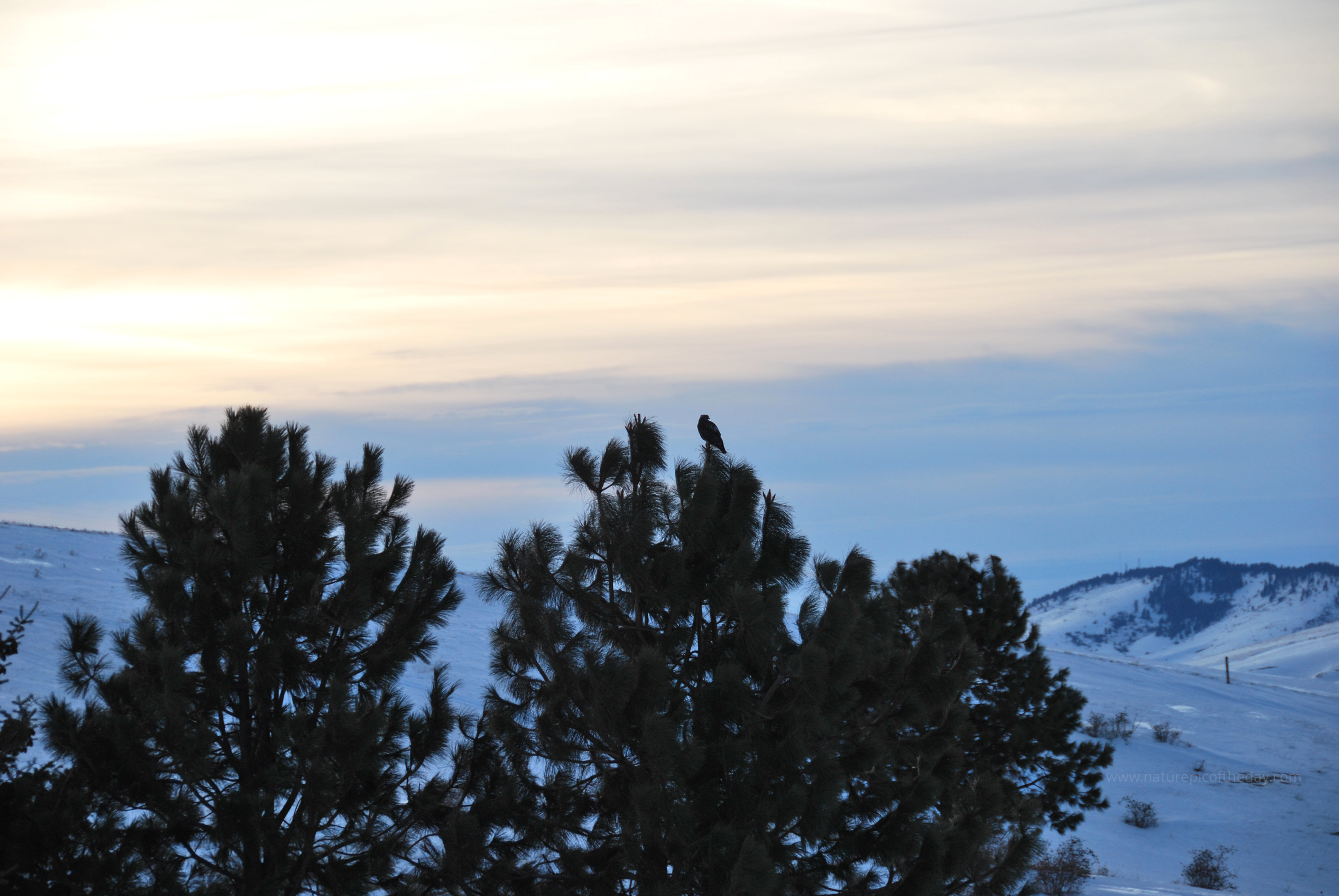 A solitary hawk perches at the top of a pine as day draws to a close.