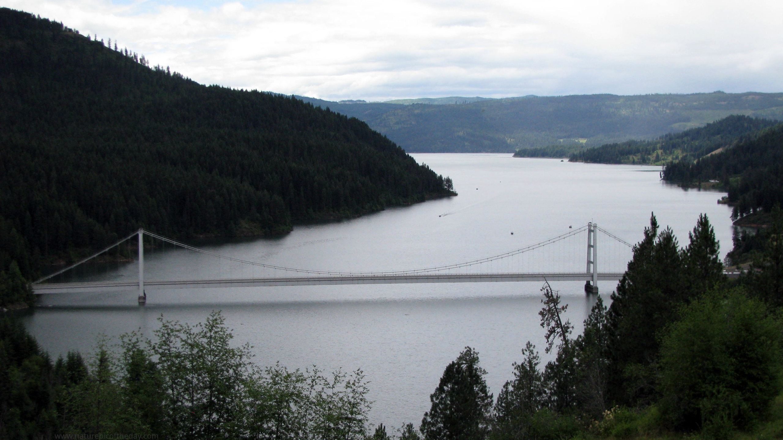 Dworshak Reservoir fills a narrow valley in Idaho.